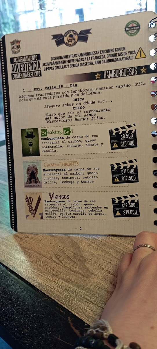 Located in the vibrant heart of Bogotá, Burger Films presents a unique culinary experience that combines delicious flavors with a fun atmosphere. The menu is a delightful mix of grilled meats and hearty sides, showcasing items like the Scareface and Toy Story, both featuring succulent cuts of meat served with your choice of crispy fries or traditional yuca croquettes.